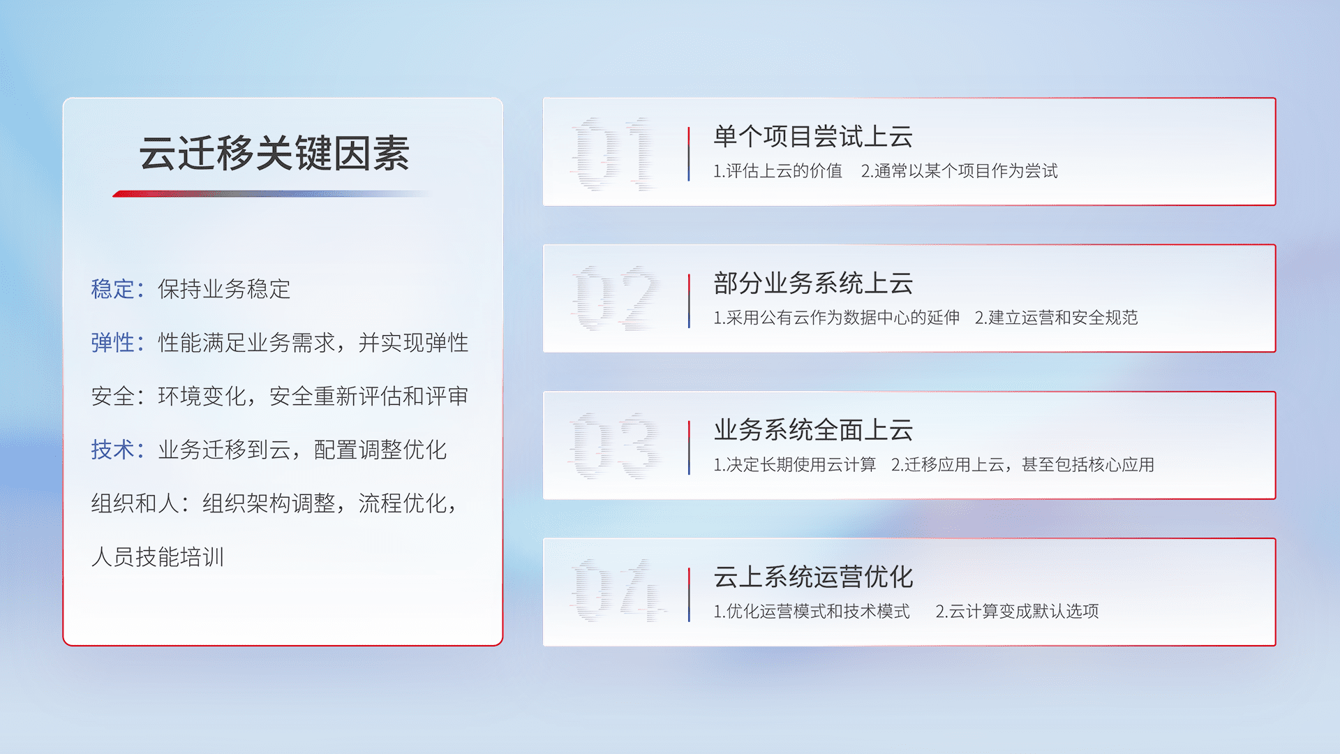 结合实际业务,,,,从规划设计、、、、云平台选型、、云原生改造、、、、数据迁移、、、、集成交付,,迁移全过程为客户识别最佳上云路径,,做好风险识别管理,,,设计网络架构、、、、身份权限、、、安全审计合规、、操作审计、、、日志审计、、、、监控告警策略、、、、多站点容灾设计等,,,,对云上基础设施进行整体规划,,提升IT治理水平,,以满足弹性、、、高可用、、高性能的需求。。。