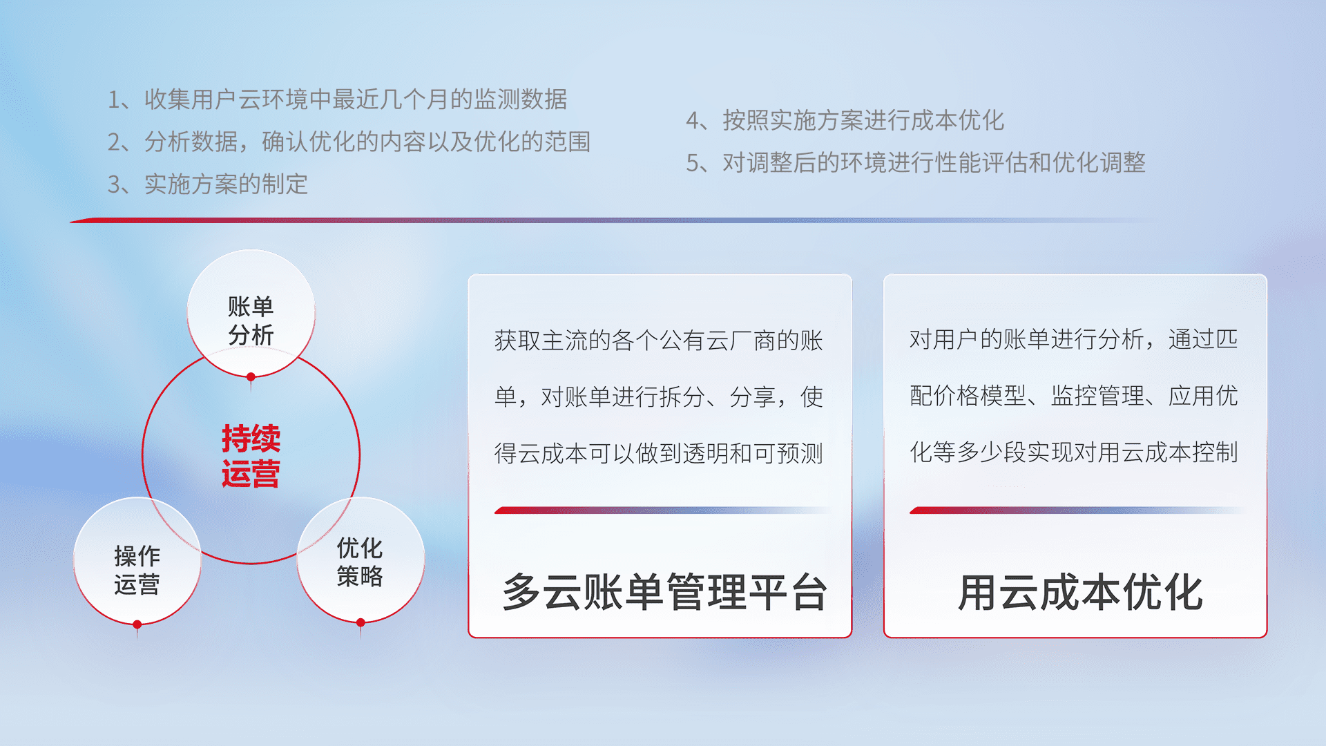 通过多云纳管,,,以统一的资源数据模型把客户的云资源进行抽象和封装,,,,进而实现对多云资源的统一操作,,,,保障云资源管理的可靠性、、稳定性与可用性。。。。量身定制化运维内容,,配置、、、开发运维、、、、补丁管理、、备份、、、、监控、、认证和访问管理、、、、审计和日常巡检等,,,,保障在用云过程中的可靠度,,稳定度以及高可用率。。
